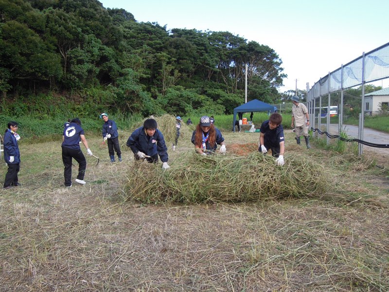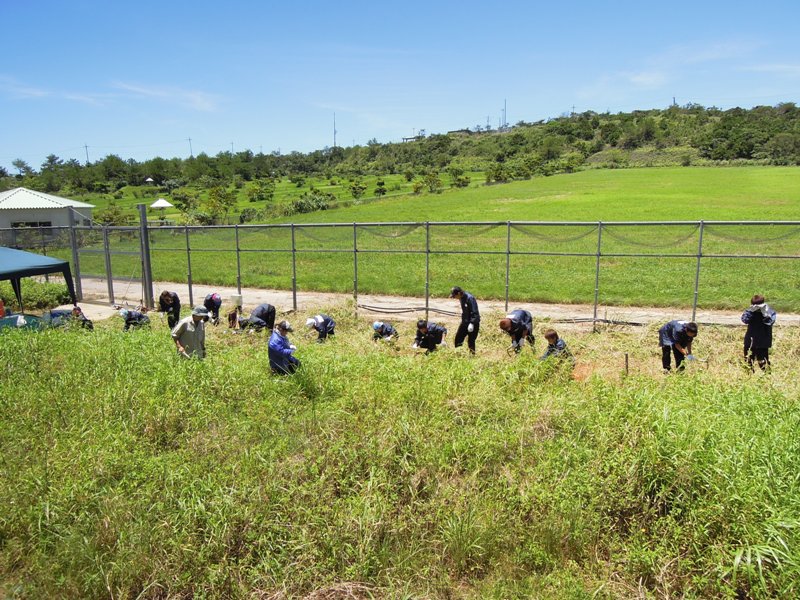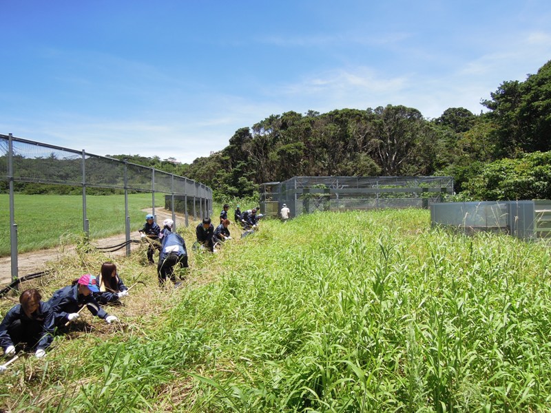6月25日、動物飼育コース1年生の生徒34名と先生2名の総勢36名に、当法人のヤンバルクイナ保護に関連する施設で、施設周辺の草刈りをやっていただきました。