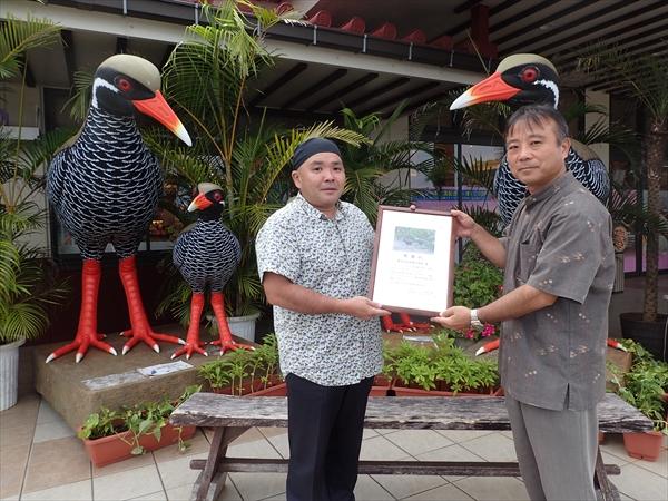 御菓子御殿様より、2013年秋に新発売された『ヤンバルクイナまんじゅう』の売上げから当法人に毎年継続してご寄附をいただいています。そのご支援に感謝し、9月1日に御菓子御殿名護店にて澤岻英樹社長へ当法人の金城副理事長から感謝状をお渡ししました。