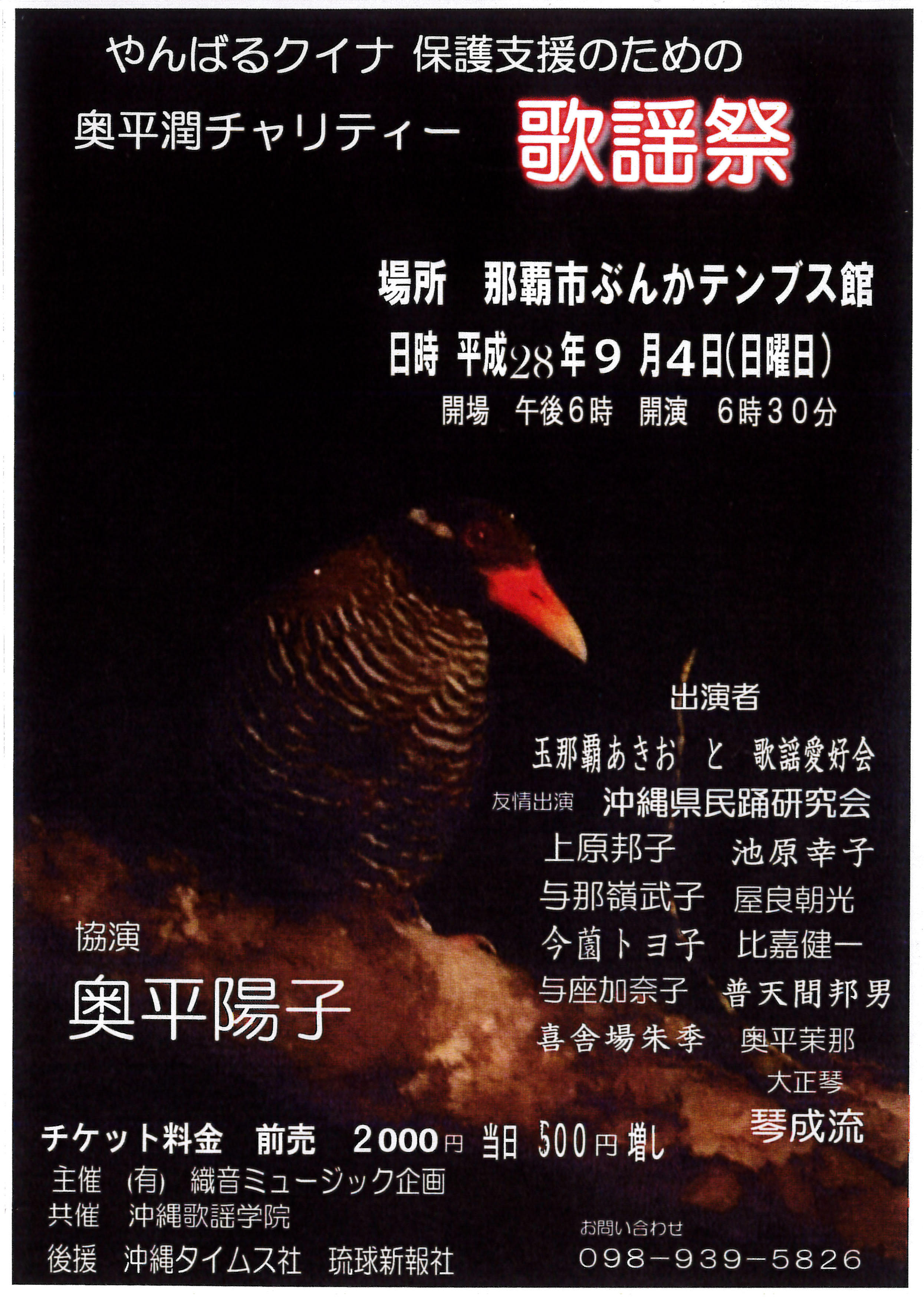 9月4日、那覇市ぶんかテンブス館で『やんばるクイナ保護支援のためのチャリティー歌謡祭』が開催され、